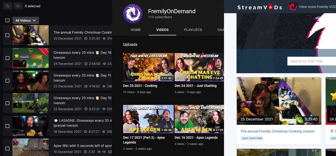 I had been wanting an easy way to upload my VODs to YouTube for ages when I finally found StreamVODs. Now it just takes me a couple of clicks and voila, my stream is uploaded with a title and description (including chapters) automatically filled out how I've customised in settings. It has made the whole upload and organisation process so easy! You also get a landing page that helps viewers find old VODs by game or title.